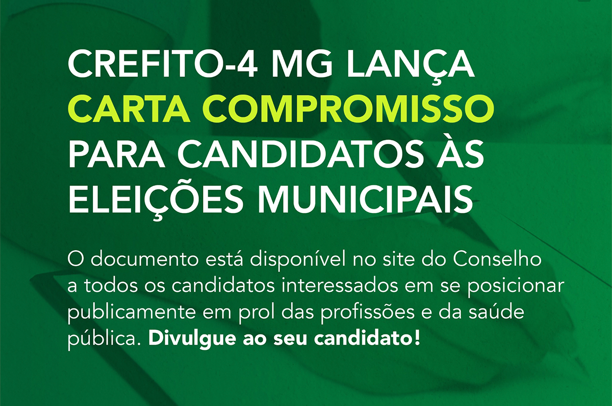 Visando a somar forças em prol da assistência à saúde digna para a população e constante evolução da Fisioterapia e da Terapia Ocupacional, o CREFITO-4 MG elaborou cartas compromisso, disponíveis a todos os candidatos das eleições municipais em Minas Gerais, de diferentes partidos e coligações interessados em se posicionar publicamente